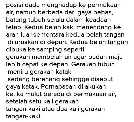 Seperti gerakan pada tangan, latihan ini melatih koordinasi ayunan kaki dengan pengambilan napas. B) membandingkan gerakan yang kamu lakukan dengan hasil pengamatan dan gerakan mana yang paling mudah kamu lakukan. Perenang dapat melakukan latihan gerakan tungkai dengan telentang, kedua lengan di atas kepala sejajar dengan telinga. Adapun, prinsip renang gaya katak yaitu gerakan menarik dan kembali merupakan prinsip gerakan lengan. Mengayunkan tangan kebelakang lalu kedepan sesuai arah jarum jam secara bergantian, seperti tangan kan terlebih dahulu diayunkan. Teori menyatakan bahwa sebuah kapal yang bermuatan ringan akan mudah ditarik atau didorong di dalam air. gerakan lengan dalam renang gaya dada berperan sebagai tenaga pendorong. Keseluruhan gaya renang merupakan kombinasi dari posisi badan, gerakan lengan, gerakan tungkai, tempo, dan pernapasan. empat prinsip gerakan pernafasan pada renang gaya dada katak adalah 1 mengambil nafas dilakukan ketika tumit kaki menarik ke dekat pinggul 2 pengambilan napas dilakukan dengan cara menaikan leher 3 mengambil udara dilakukan dengan cepat menggunakan mulut 4 membuang nafas dilakukan di dalam air saat kaki mendorong ke belakang. Seperti yang sudah di terangkan pada awal kalimat renang gaya dada dapat disebut juga sebagai renang gaya katak karena renang ini dapat di pelajari oleh banyak orang. Memulai adalah teknik yang harus dikuasai setiap perenang. renang adalah salah satu dari berbagai aktivitas air yang diatur sedemikian rupa sehingga menghasilkan suatu gerakan yang baik dan teratur. Pengambilan napas renang gaya punggung dilakukan melalui ….