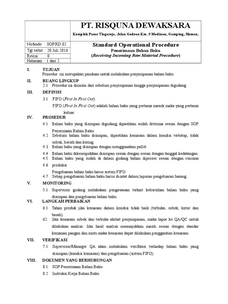 Tersedia sop tanggap darurat, smk3 dan perlengkapan antara lain : 3 komplek gudang 44 komplek gudang 4 unit gudang 158 unit gudang 5 kapasitas gudang 430.000 ton 6 unit penggilingan gabah dan beras (upgb) 22 unit. Diantaranya adalah sop penerimaan, penyimpanan, pemeriksaan persediaan, pengambilan pesanan, pengiriman dan penanganan retur. Mengatur semua staff gudang dan menjadi pemimpin bagi semua staff gudang. Warehouse (gudang penyimpanan) memiliki peranan yang begitu penting dalam sistem logistik dan manajemen rantai pasok. Dimana hal ini mengakibatkan demotivasi bagi karyawan di bawah yang tentu menghendaki adanya satu standarisasi kerja. Standard operating procedure (sop) sop (standard operating procedures) gudang (logistic). Modul dikbangspes sarpras pusdikmin lemdikpol penerimaan, penyaluran, penyimpanan dan pendistribusian barang 11 identitas barang berisi informasi tentang nama barang; Menghemat anggaran, anda dapat membuat sop perusahaan anda sendiri dengan biaya murah tanpa bantuan konsultan. Detail contoh sop penyimpanan barang pdf dapat. Memastikan penanganan dan penyusunan barang dilakukan dengan baik. Untuk memantau kondisi suhu penyimpanan, di dalam ruangan gudang ditempatkan termometer, sehingga pengecekan kesesuaian suhu gudang dapat dilakukan dengan mudah setiap saat. Rumah sakit umum daerah naibonat merupakan salah satu rumah sakit.